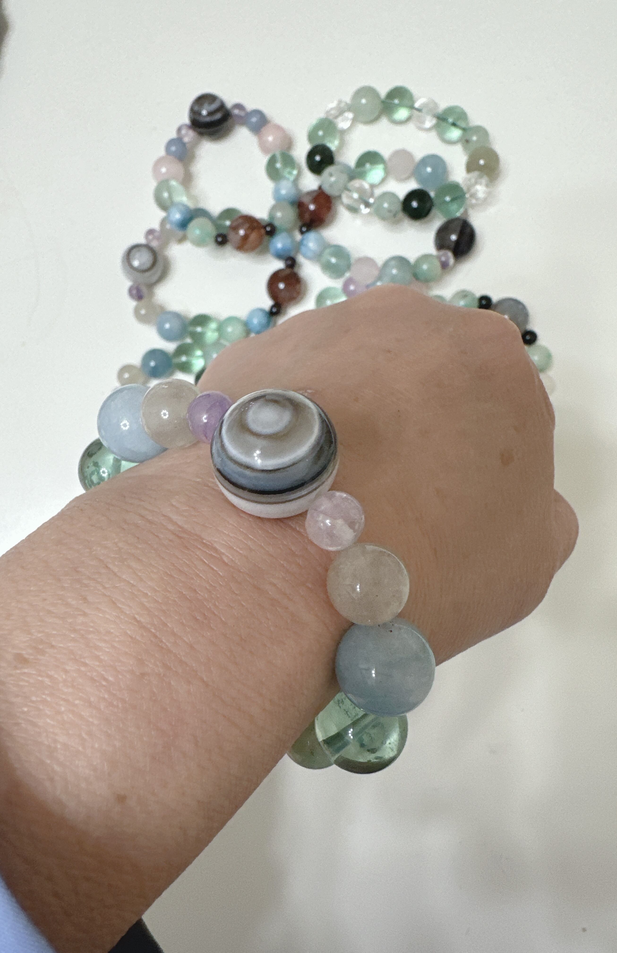 春分を象徴する「春分〜天地統合〜サナトクマラブレス」は、リビアングラス、天眼石、フローライト、アフガナイト、ヒマラヤK11、レッドファイヤーアゼツライトを使用した美しいアイテムです。これらのストーンはそれぞれに独特のエネルギーを持ち、身に着けることであなたのバランスを整え、心身をサポートします。