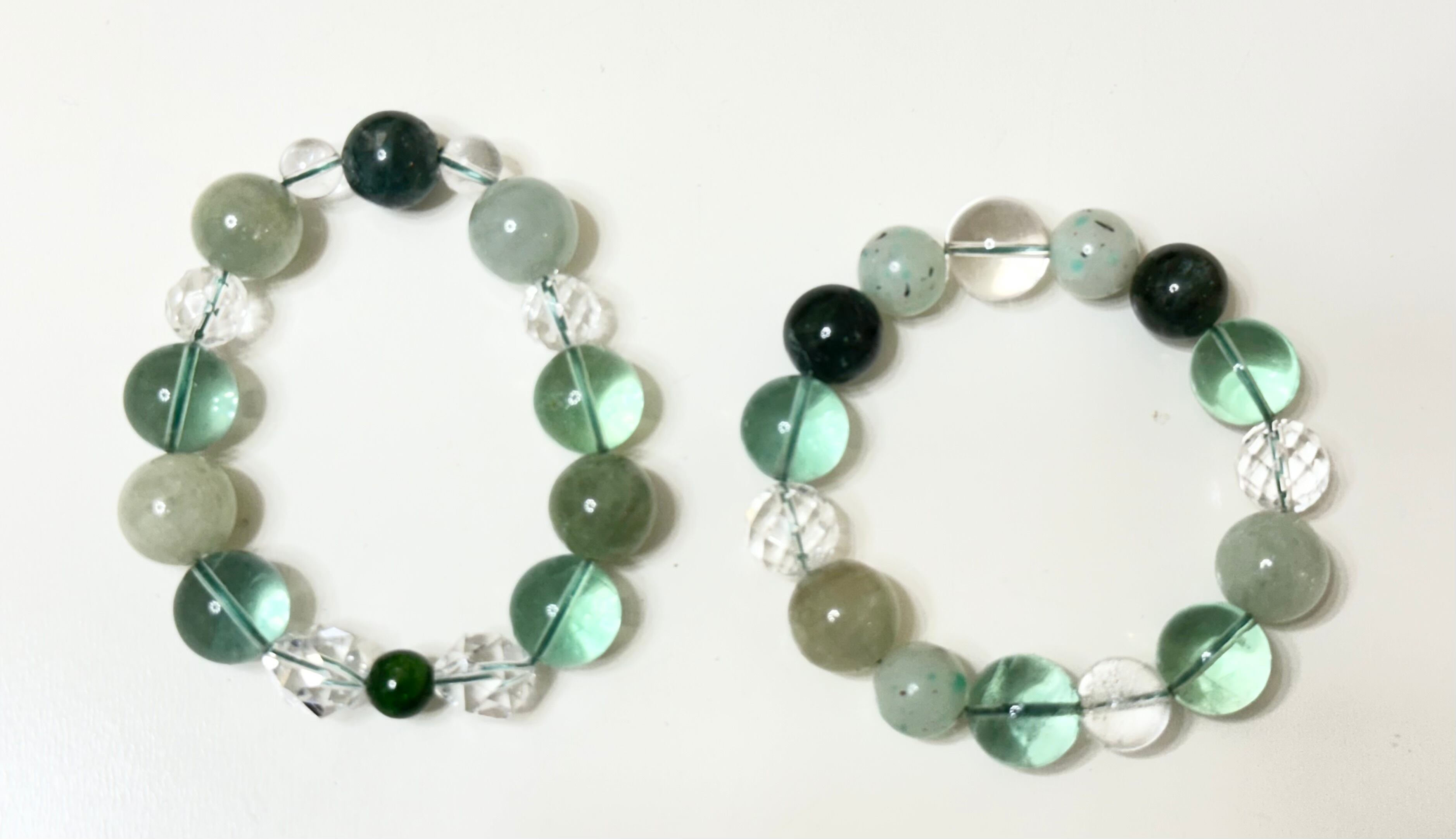 フローライトは思考を整理し、洞察力を高める手助けをします。グリーンアパタイトは新しいエネルギーを与え、自己変容を促進します。グリーンベリルは心の平和をもたらし、内なる安定感を育みます。水晶はエネルギーをクリアにして、あなたを守る力があります。フェルドスパーは意識を拡大し、創造力を引き出すサポートをします。