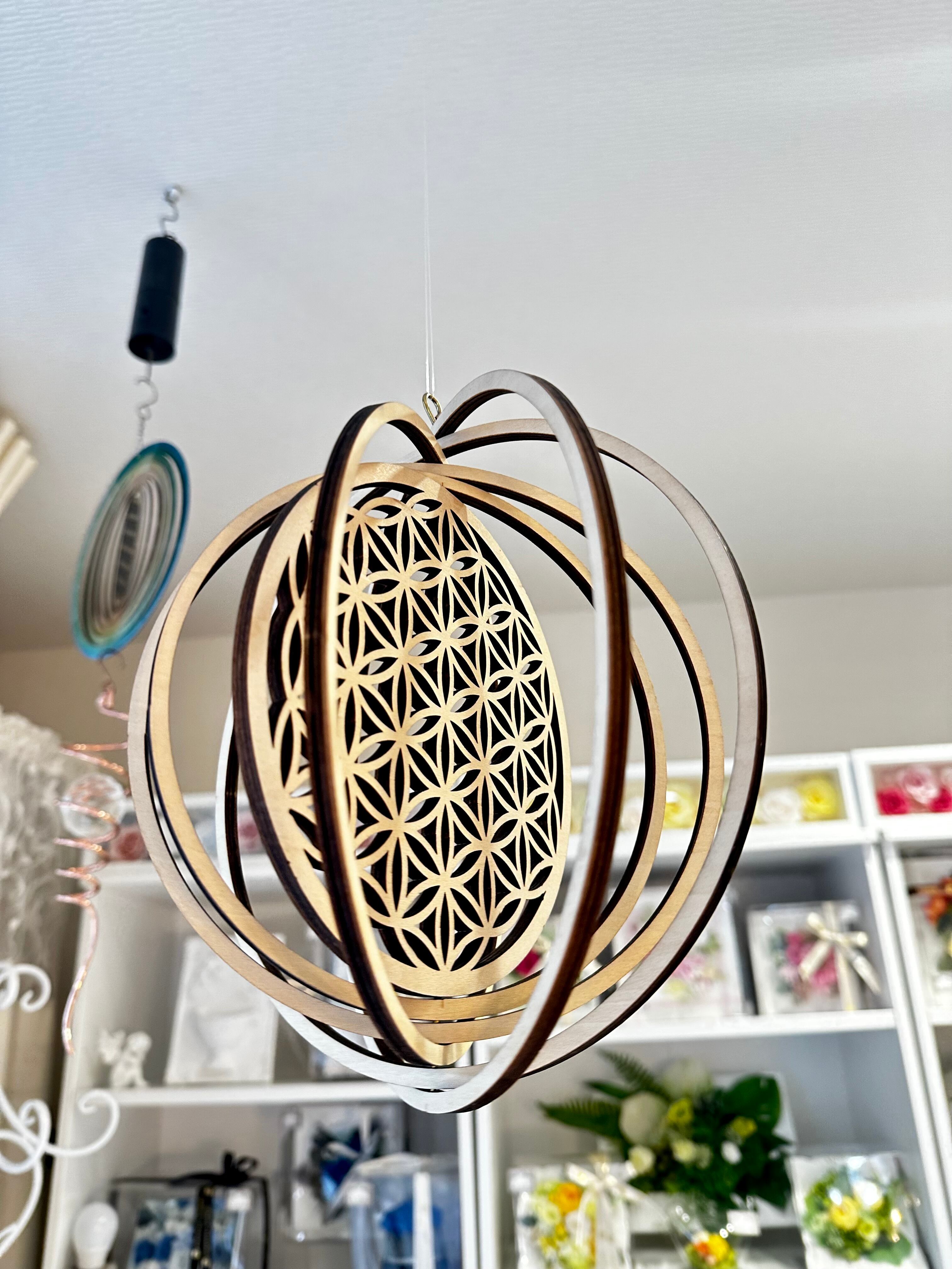 フラワーオブライフモビールは、美しく緻密に刻まれたフラワーオブライフが特徴の、オリジナルデザインのモビールです。フラワーオブライフとは、宇宙の調和や共振を表す古代の図形で、心地よい波動を放つとされています。